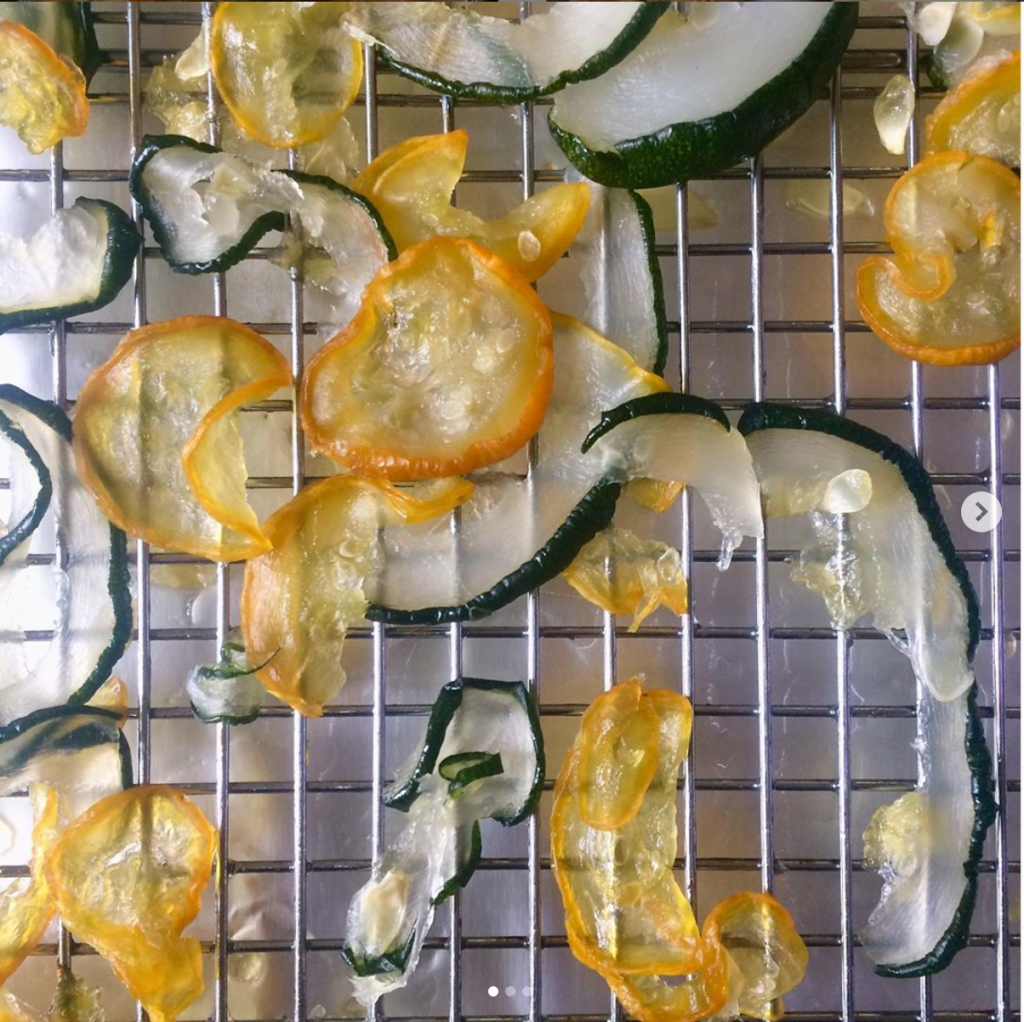 I came upon a windfall of summer squash (yay, kitchen inventory surplus). By windfall, I mean like 15 pounds worth (see last photo). Ten pounds worth were portioned for the freezer into one cup shredded patties (second photo). A few ounces worth were simmered in a simple syrup and dried for candied squash (first photo). And the last bit, I sliced and plan to bake into galettes. Oh, and I threw some salt onto the squash before processing, to draw out as much water as possible.
